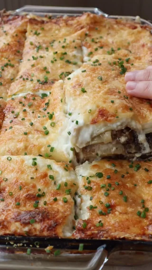 A saucy, creamy white lasagna layered with brandy-glazed mushrooms, béchamel, Parmesan, and mozzarella.