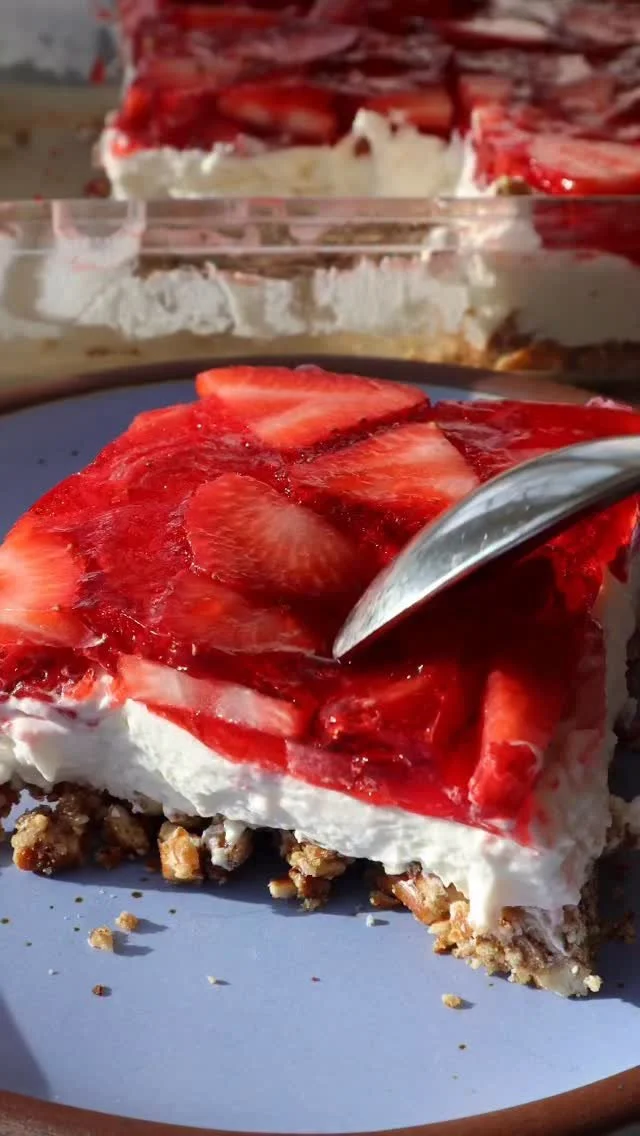 A small-batch version of Ina Garten’s flag cake- vanilla (plus a little almond) sheet cake topped with cream cheese frosting and fresh berries