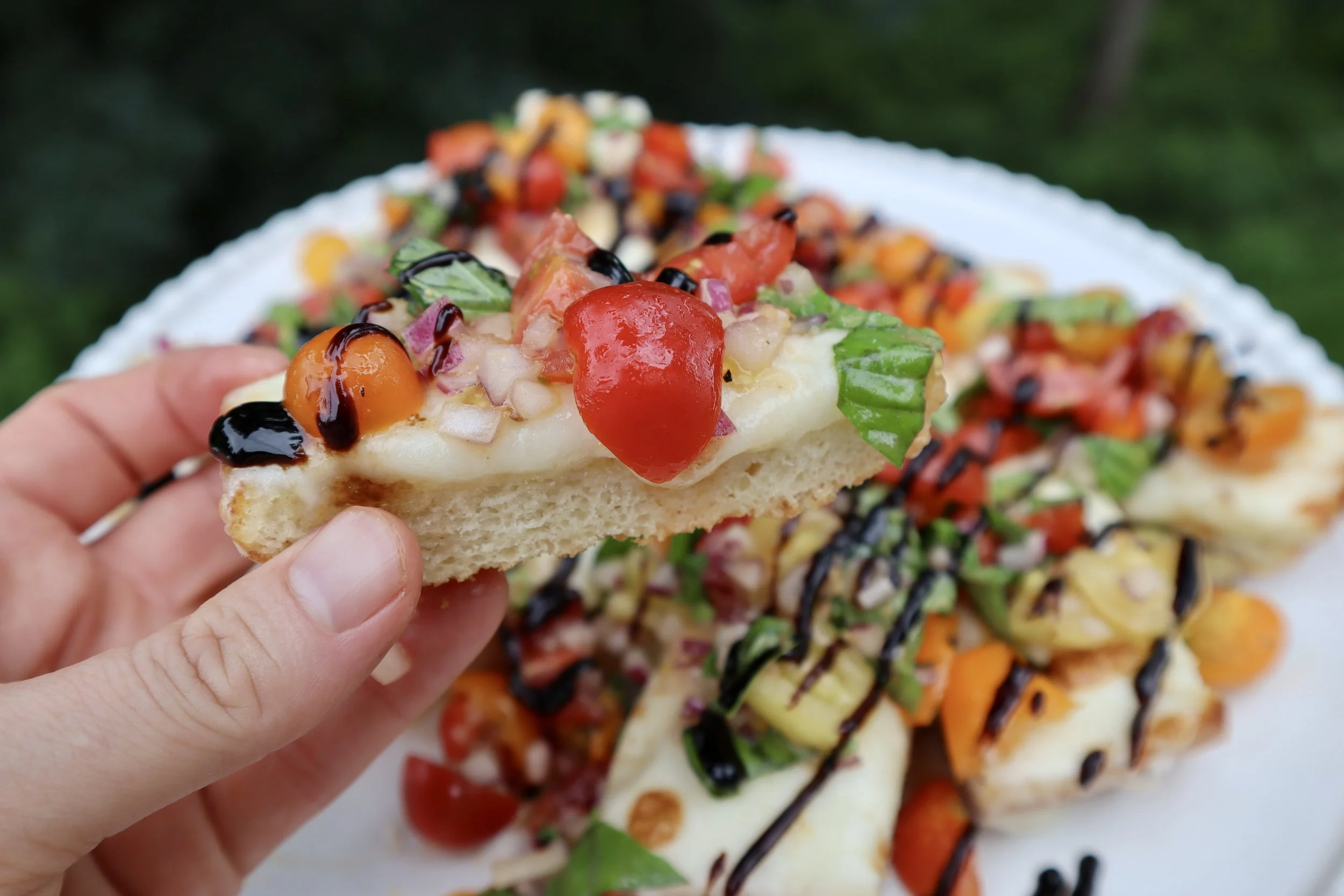 Garlic bread broiled with fresh mozzarella and then topped with a refreshing cherry tomato mixture, basil, and balsamic reduction!