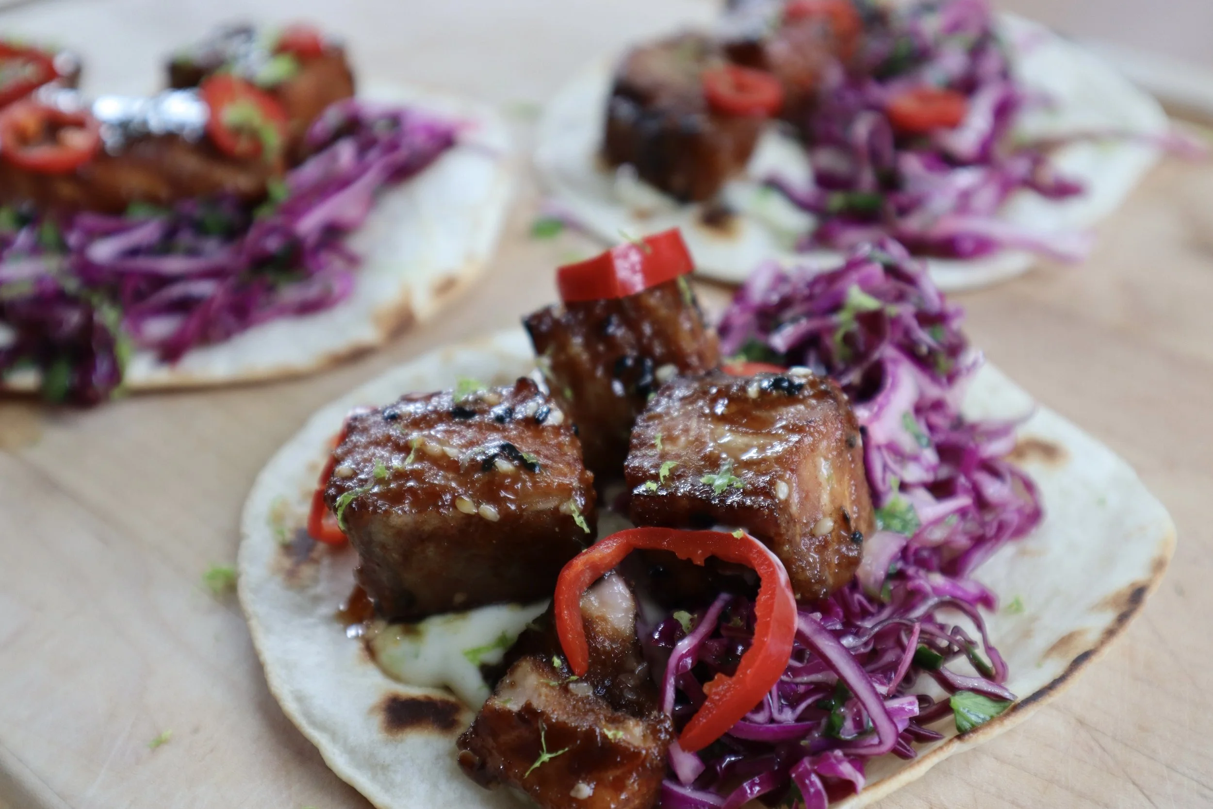 Marinate the salmon cubes in soy sauce and olive oil. Mix the brown sugar spice blend, then toss the salmon in it and bake until caramelized. Make the slaw by combining cabbage, lime, honey, ginger, cilantro, and chiles. Whisk together the honey-wasabi mayo. Warm the tortillas, spread with mayo, layer on slaw, top with salmon bites, garnish with cilantro, and squeeze lime over the top.