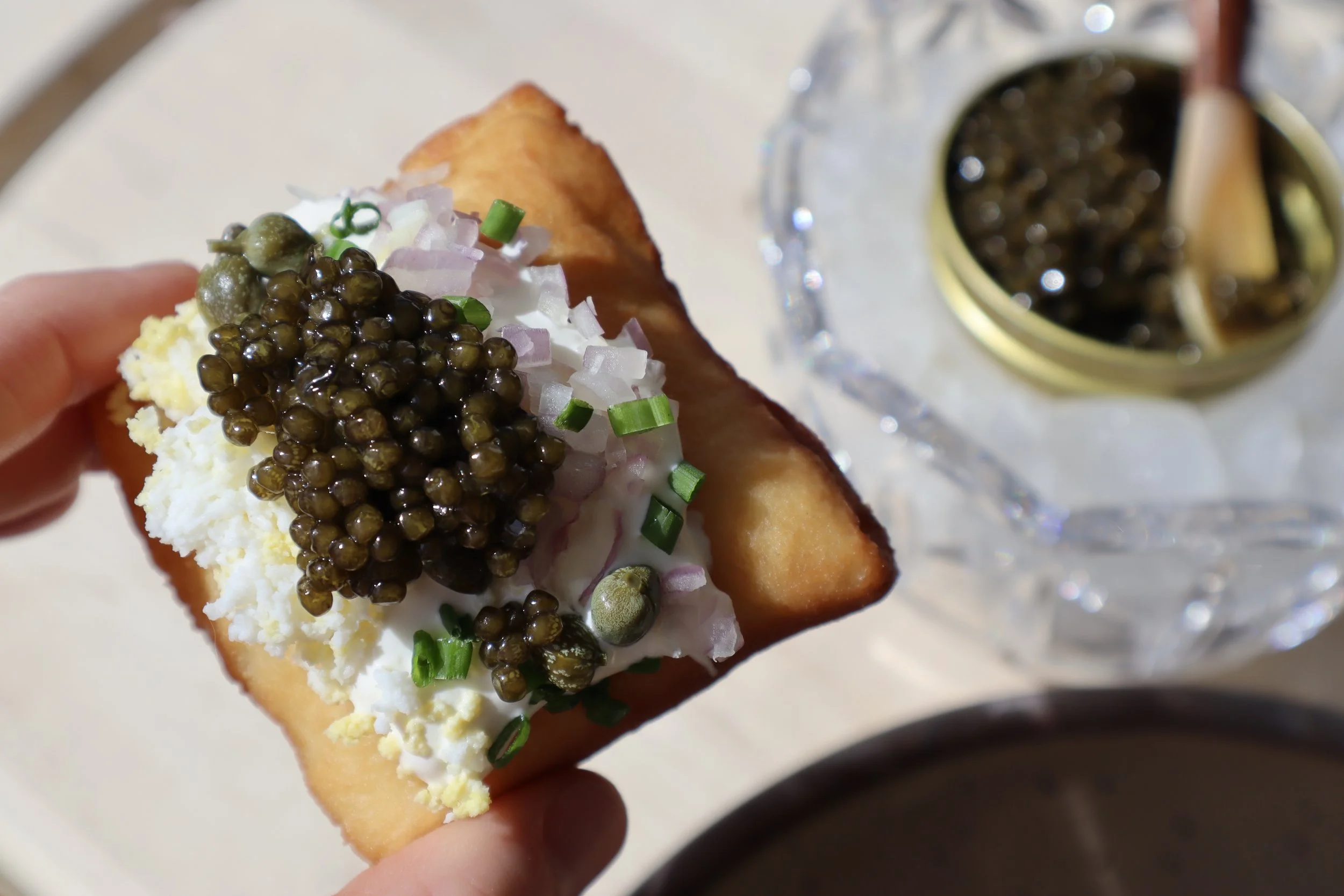 Bloom the yeast in warm milk and sugar, then add egg, evaporated milk, butter, and flour to form a soft dough. Knead until smooth and let rise until doubled. Roll out the dough, cut into squares, and fry until golden and puffed. Set up a caviar board with grated egg, minced shallots, capers, chives, and chilled caviar over ice. Split or lightly press the warm beignet to create a pocket, spread with crème fraîche, add a spoonful of caviar, and finish with toppings. Enjoy immediately while warm.