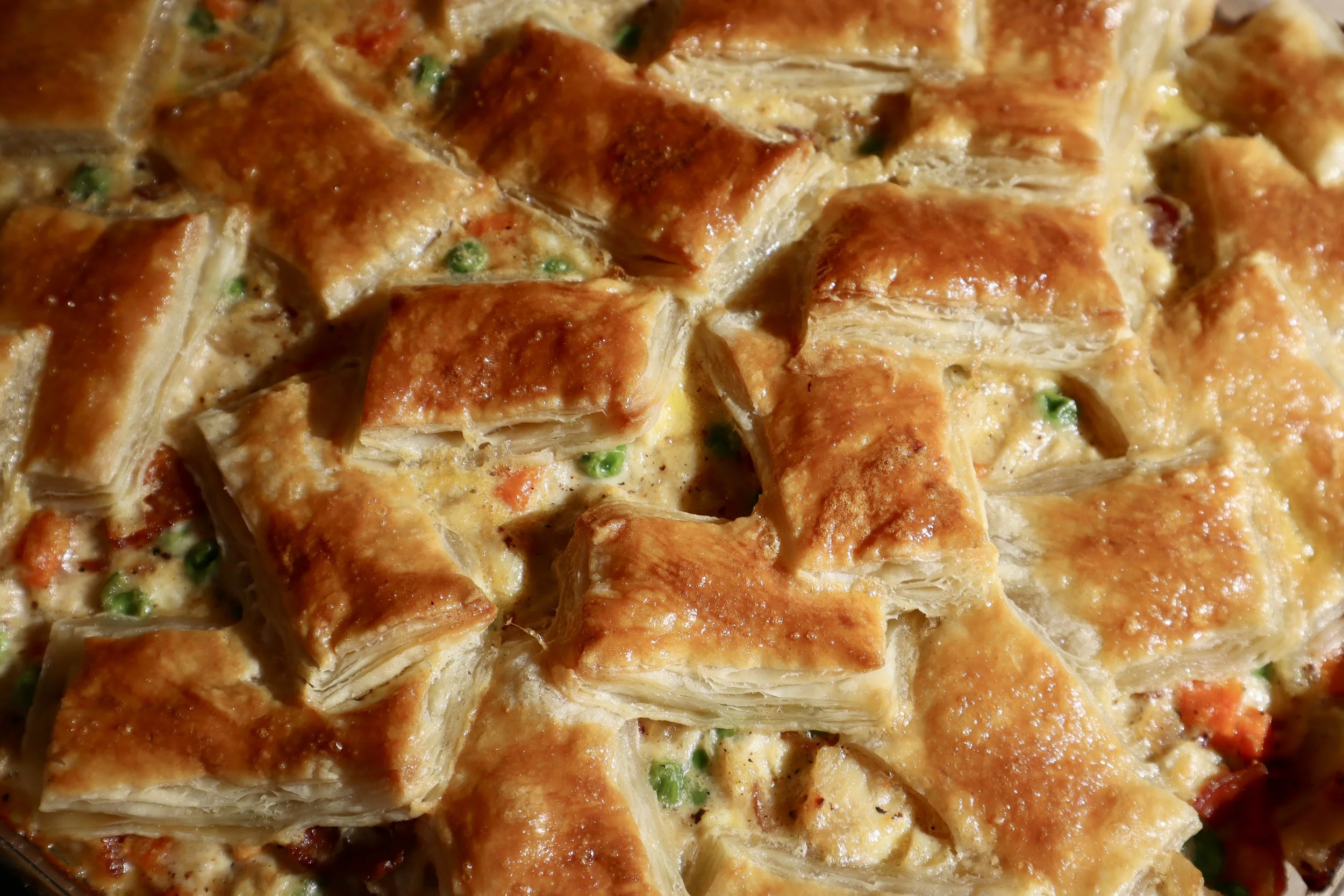Cook bacon and set aside, keeping a few tablespoons of the bacon fat in the pan. Sauté onions, garlic, and carrots until tender, then stir in flour to form a light roux. Whisk in the bouillon mixture and heavy cream until thickened. Add herbs, bacon, peas, and shredded chicken. Pour into a baking dish. Top with puff pastry (bottom crust optional), brush with egg wash, and bake until golden, bubbly, and crisp. Let cool slightly before serving.