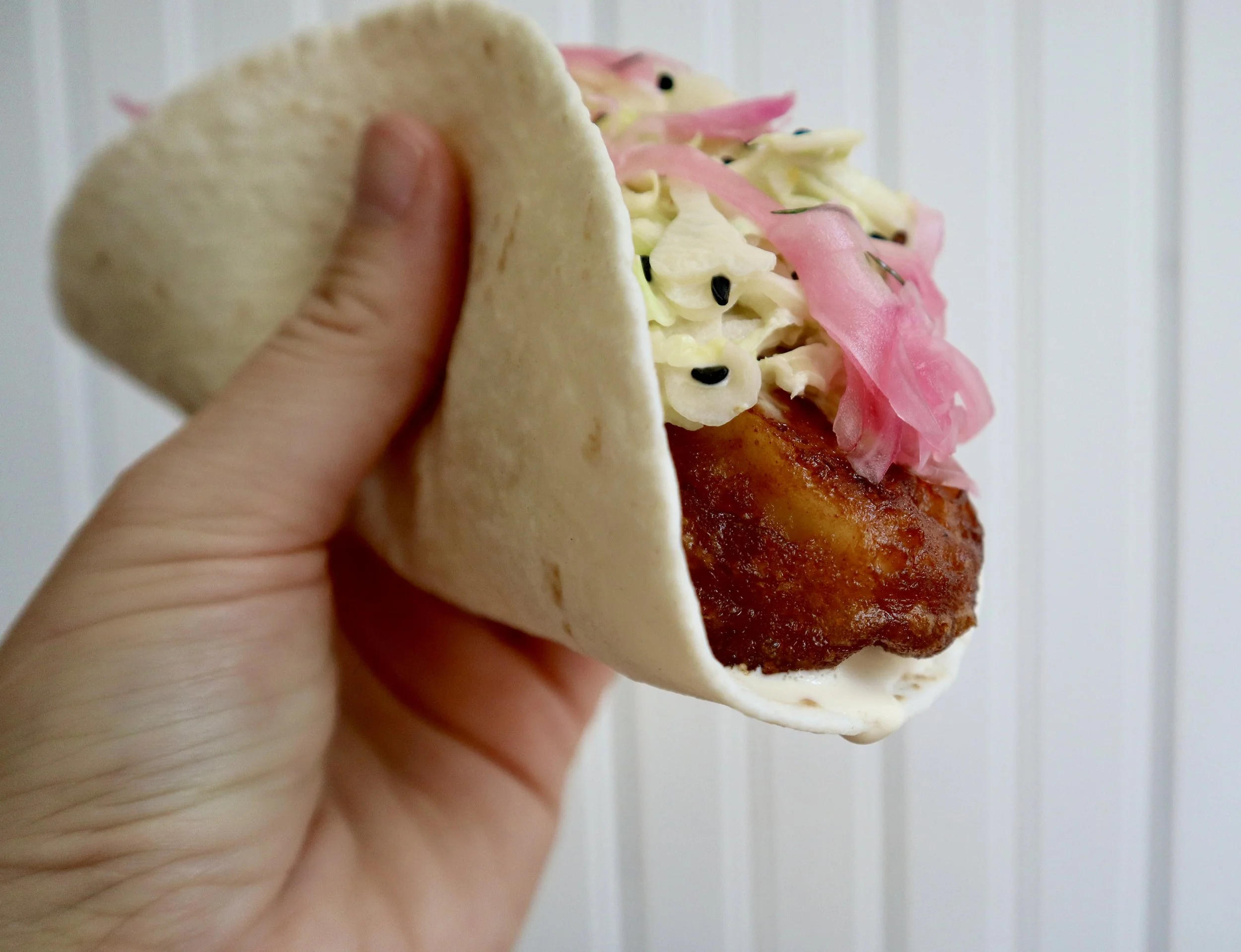 Mix the slaw dressing ingredients, then toss with shredded cabbage and chill. Slice the cod into strips and whisk together the batter using flour, spices, egg, and root beer/beer/soda water. Heat oil to 350°F, dip each piece of cod into the batter, and fry until deeply golden and crisp. Warm your tortillas, add crispy cod, top with slaw, finish with pickled red onions, and eat immediately while hot and crunchy.