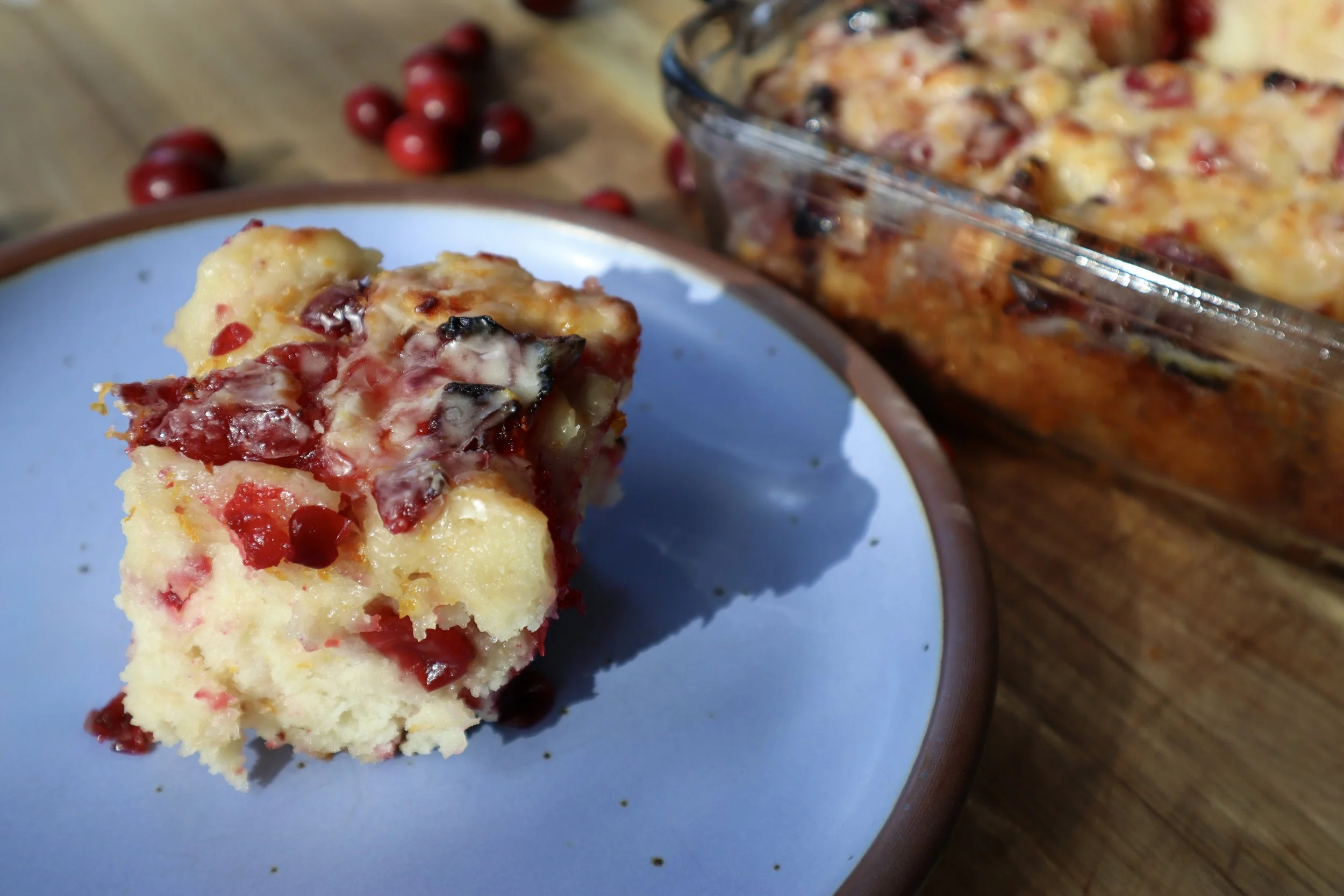 Make a quick cranberry orange jam on the stovetop. Mix the dry ingredients with sugar and orange zest, stir in cranberries, then add buttermilk. Melt butter in your baking dish, pour in the batter, and swirl the jam throughout. Bake until golden and bubbly, then drizzle with a simple orange glaze.