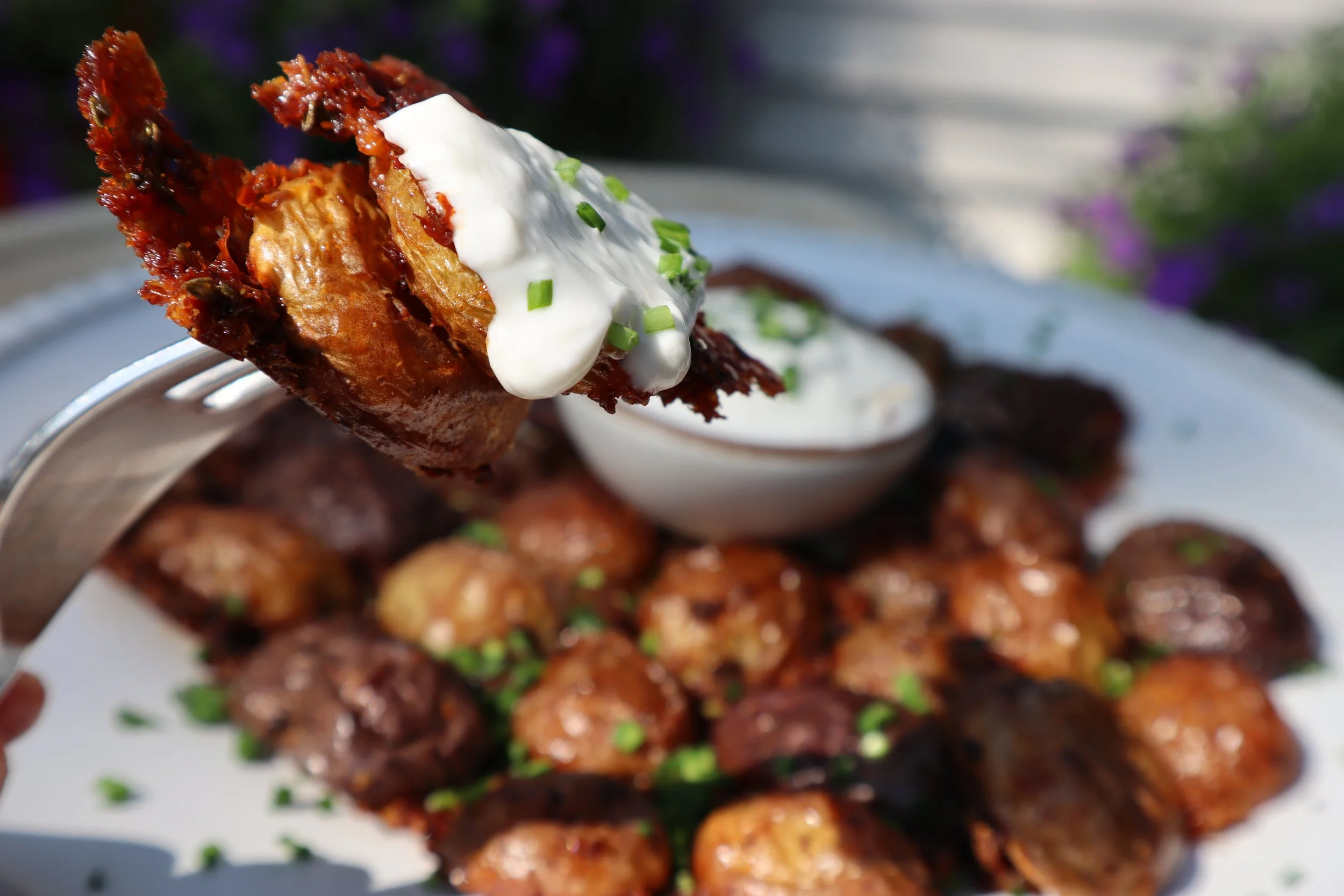 Coat halved baby potatoes in a mixture of olive oil, ’nduja, and garlic. Spread a parmesan-herb mixture across the bottom of an oiled baking dish, then place potatoes cut-side down into the cheese. Roast until the bottoms form a crispy, golden parmesan crust and the potatoes are tender. Let the sheet rest for a minute, lift out in pieces, and serve hot with your favorite dipping sauce.