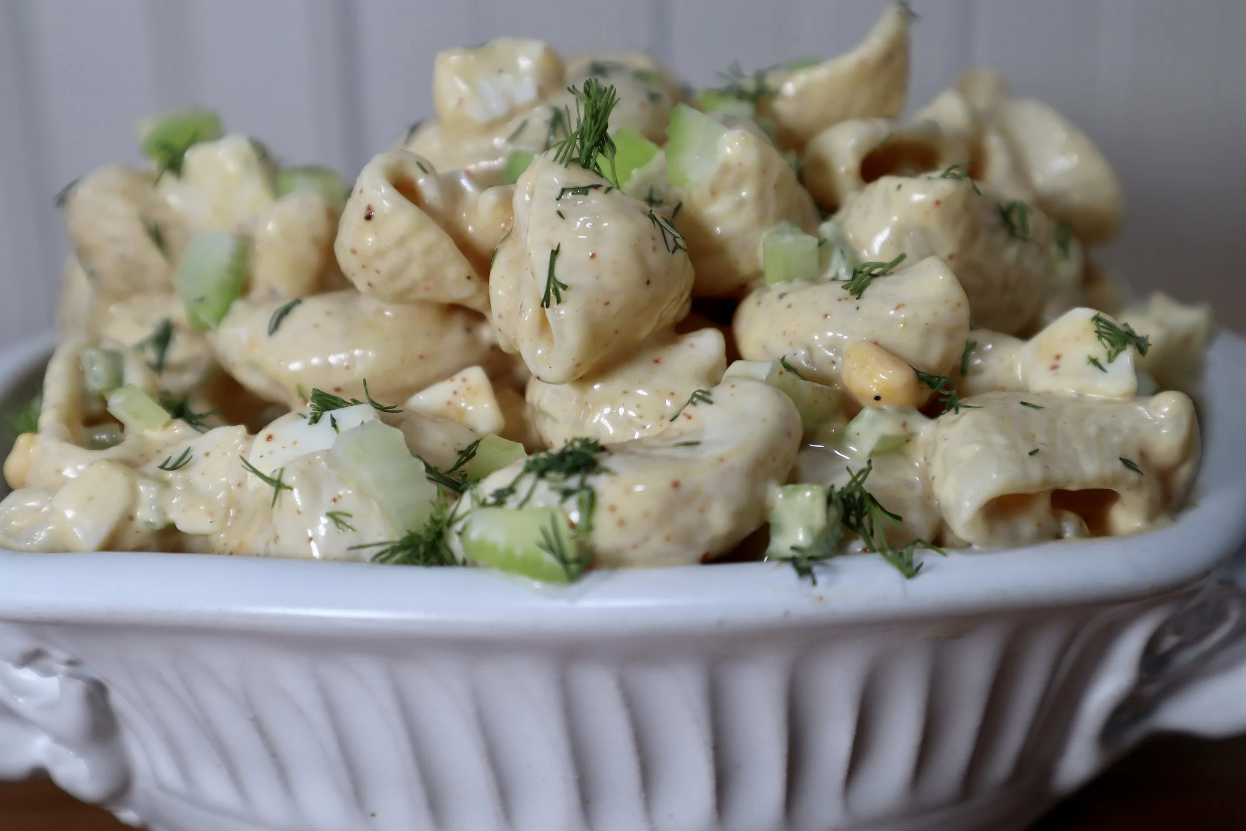 Boil the eggs and cool them in an ice bath, then peel and chop. In a large bowl, whisk together the mayonnaise, honey, mustard, celery salt, salt, pepper, and cayenne until smooth. Fold in the diced celery and chopped eggs. Add the cooked and cooled pasta, mixing gently until everything is well combined. Chill for 1–2 hours before serving so the flavors meld and the salad thickens.