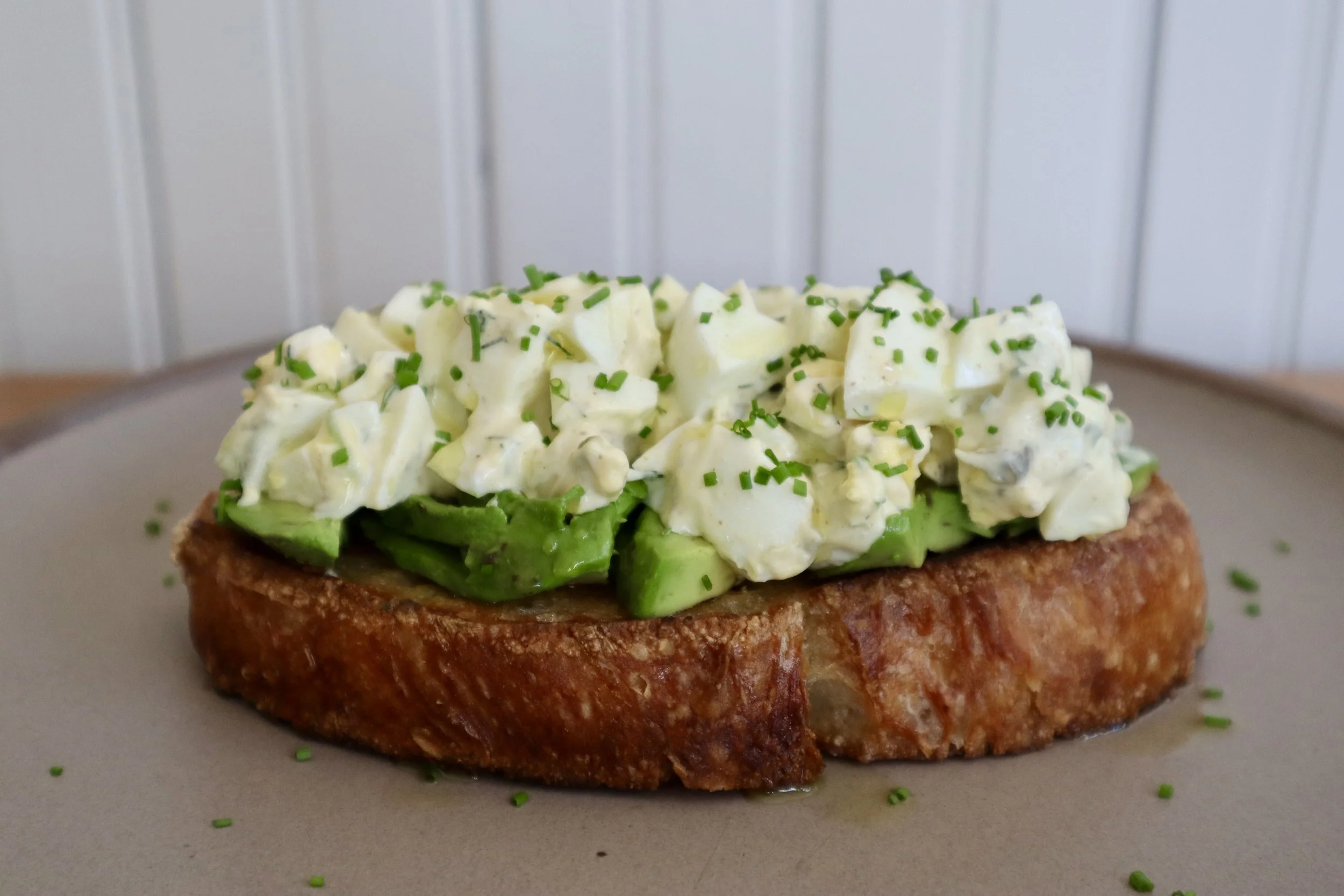 Mix together the mayo, mustard, green onion, dill, capers, celery salt, and pepper. Fold in chopped hard-boiled eggs and season with salt. Pan-fry slices of thick bread in butter until golden and crisp. Smash or layer avocado onto the warm toast, top with a generous scoop of egg salad, and finish with truffle oil and chives if you’re feeling indulgent.