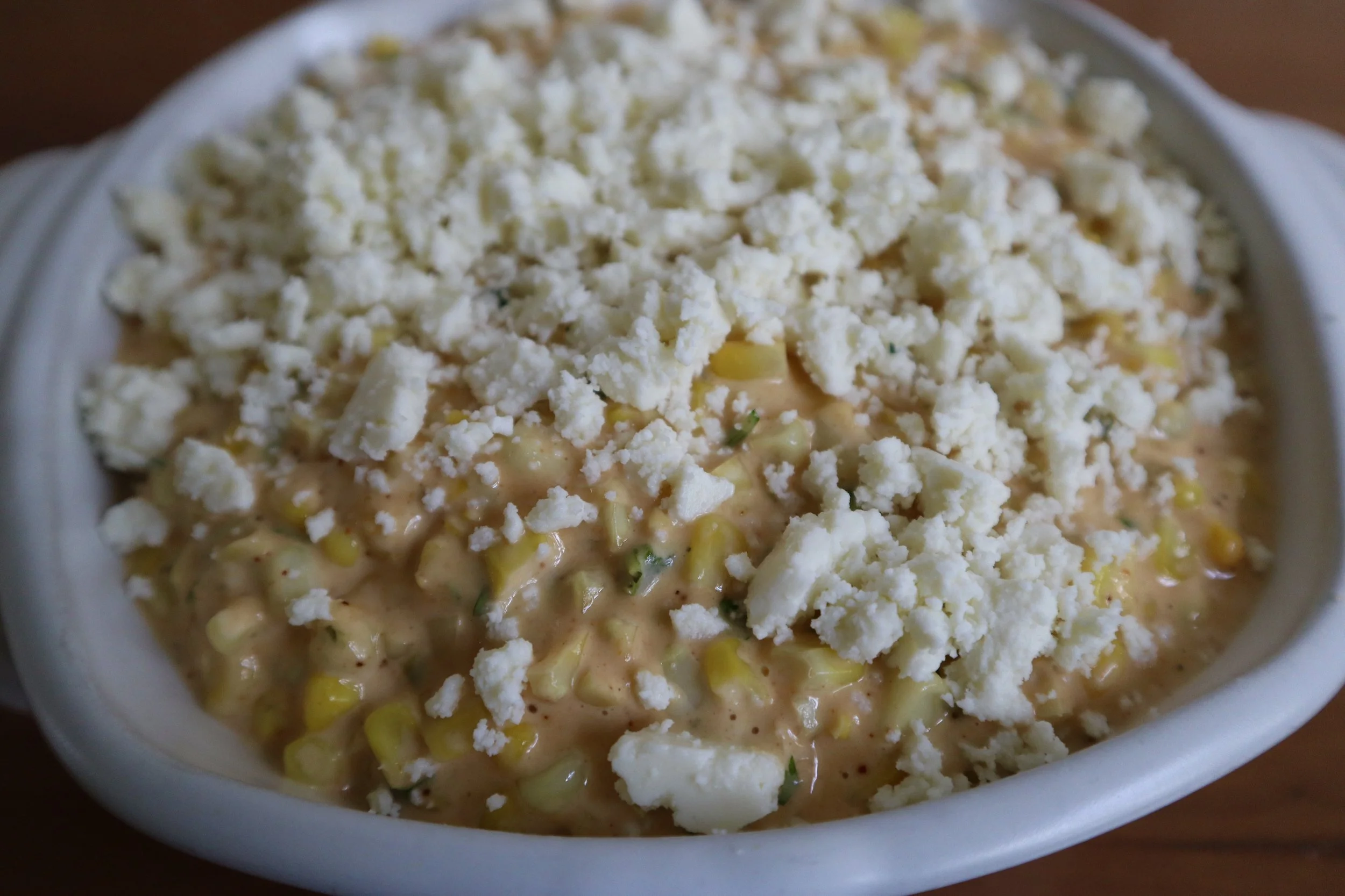 Grill the corn until charred, then cut off the kernels. Sauté garlic and jalapeño in butter, add the corn, and cook until caramelized. Once it cools slightly, stir in mayo, lemon or lime juice, elote seasoning, honey, Tabasco, cilantro, and salt. Finish with queso fresco on top and serve with tortilla chips.