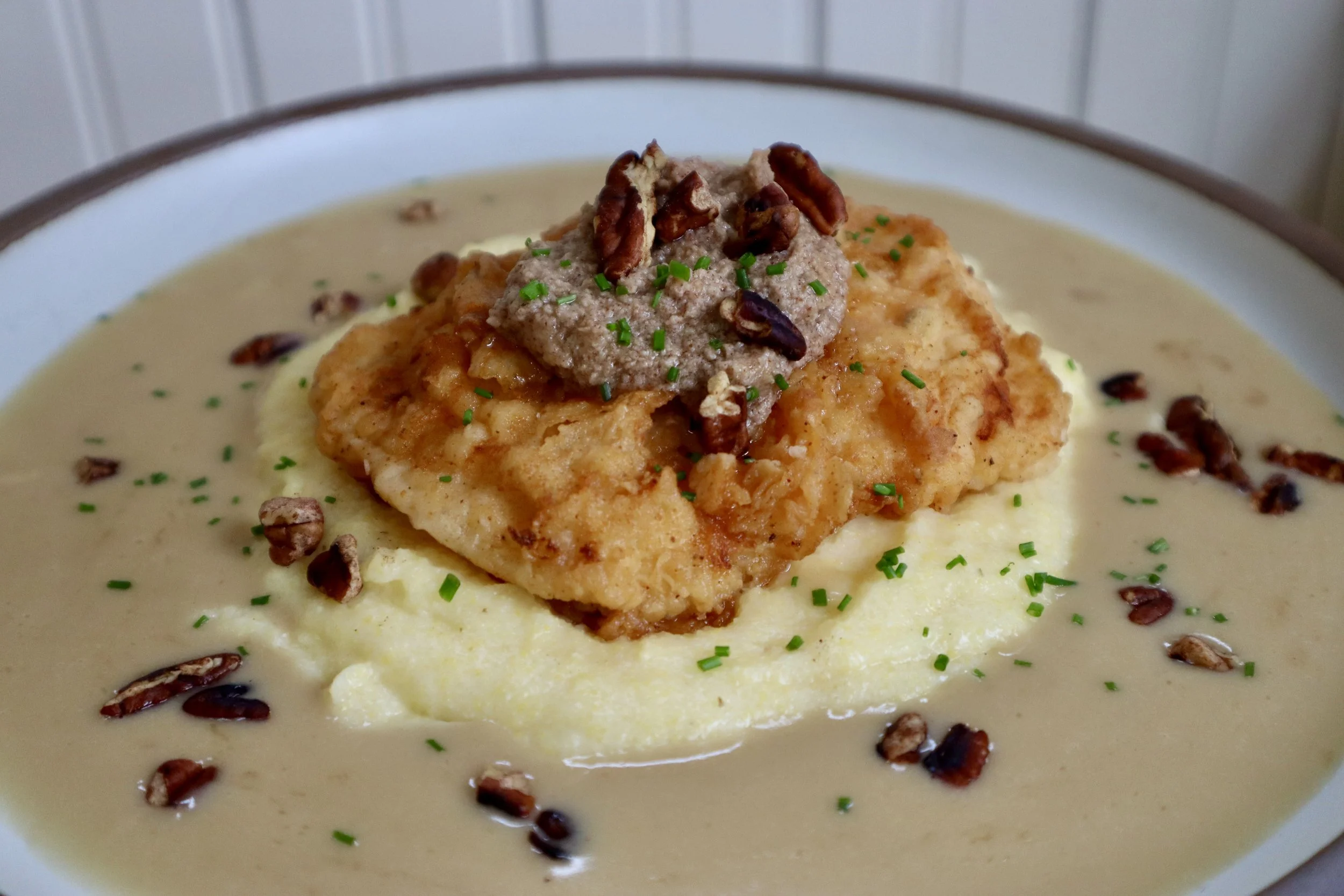 Mix the seasoning blend and prepare both sauces—pecan butter in a food processor and meunière on the stovetop. Season and dredge the fish in flour, dip in the milk-egg mixture, then dredge again. Fry the fillets in hot oil until crisp and golden. While still hot, spread each fillet with pecan butter so it melts into the crust. Serve the fish over creamy parmesan polenta with toasted pecans and a generous spoonful of meunière sauce.