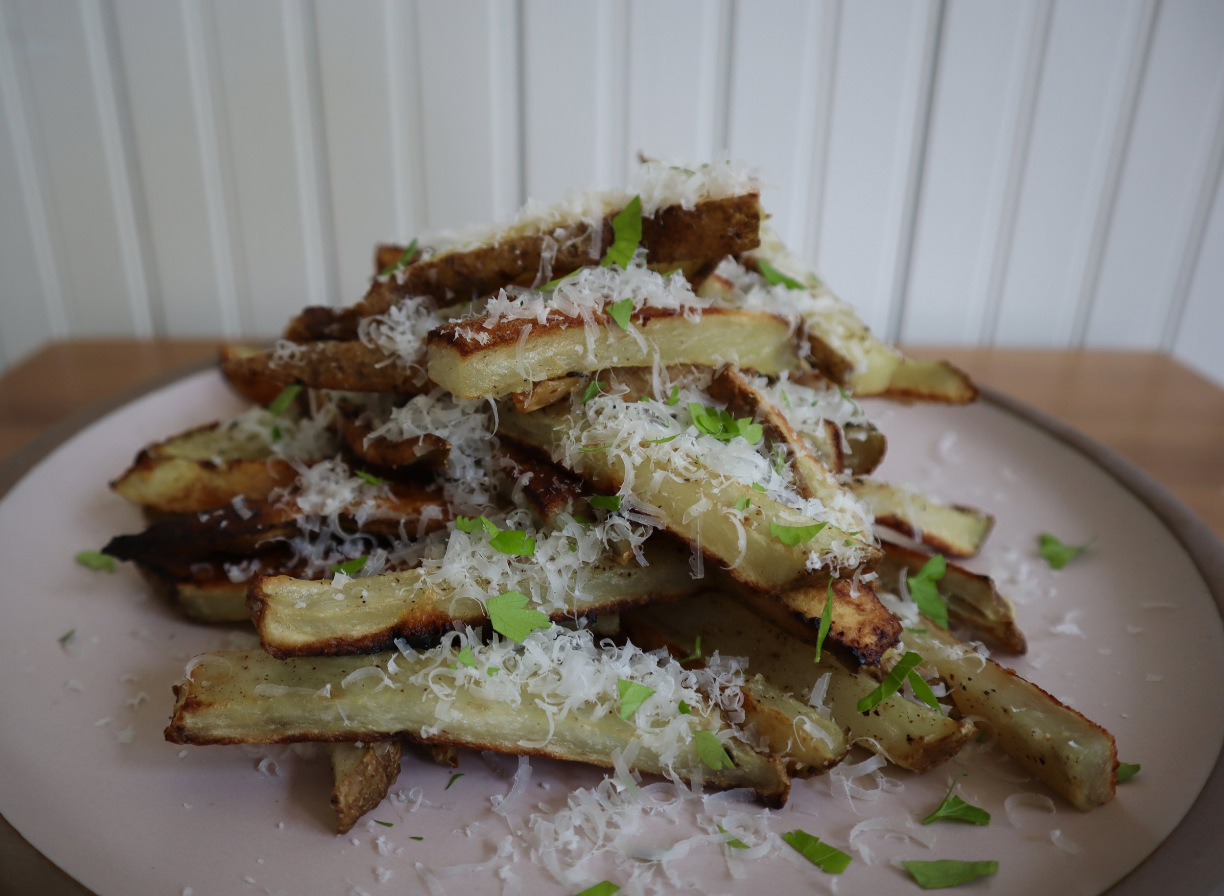 Slice the potatoes into fries and toss with olive oil and grated garlic. Spread them out on a parchment-lined baking sheet, season well, and bake at 425°F until crispy and golden, flipping halfway through. Finish with freshly grated Parmesan (plus parsley or truffle oil if you want to be fancy).