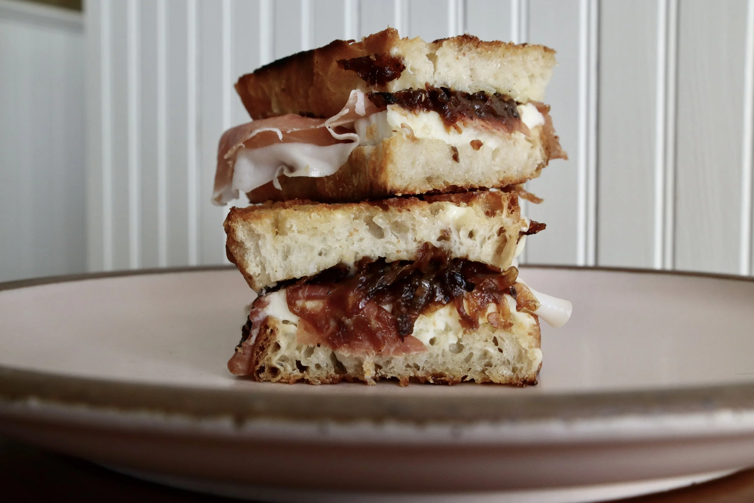 Spread butter on bread and fry in pan until golden brown & crispy. Add aioli, jammy onions, prosciutto and mozzarella (and/or any other toppings that you’re into) and let your tastebuds have the time of their lives!