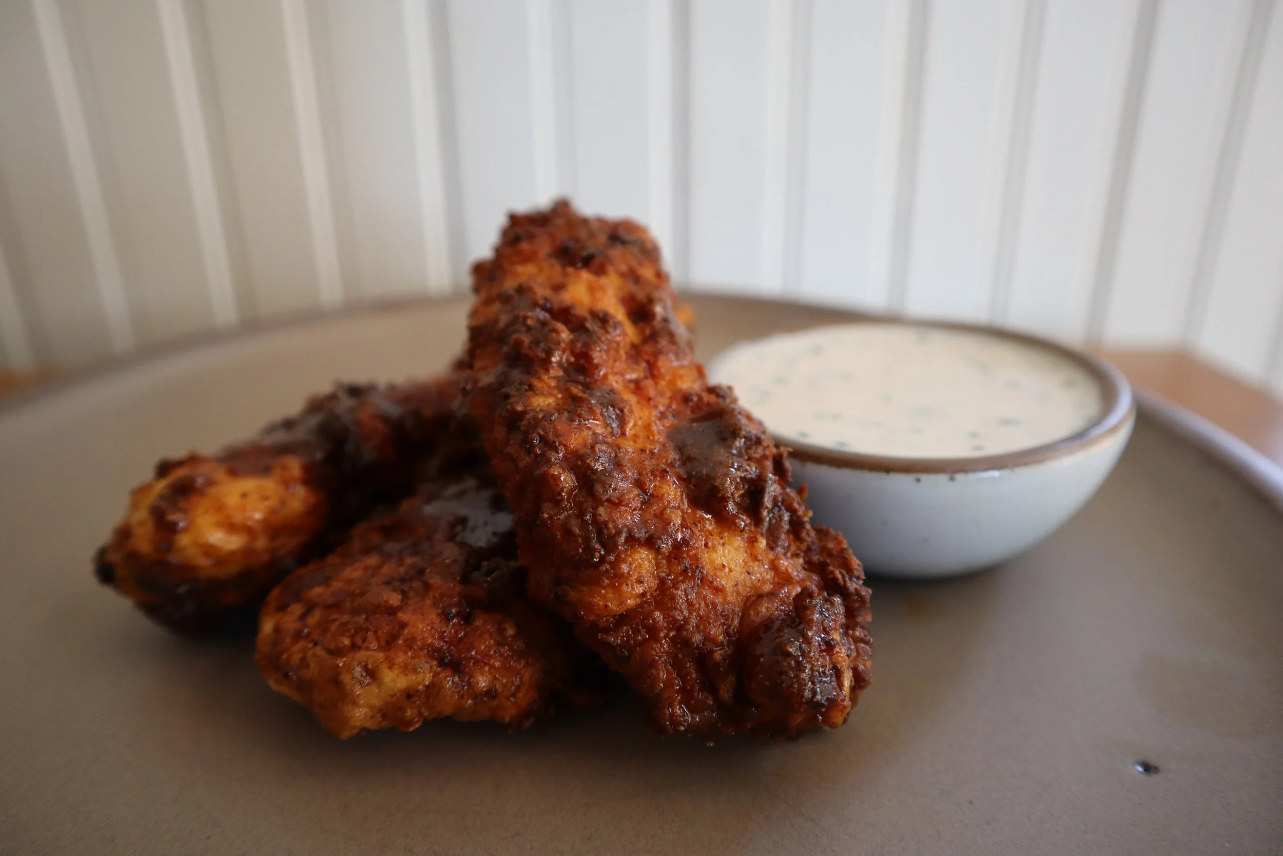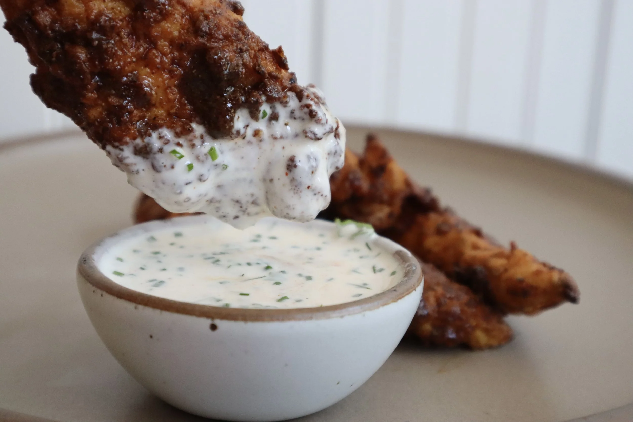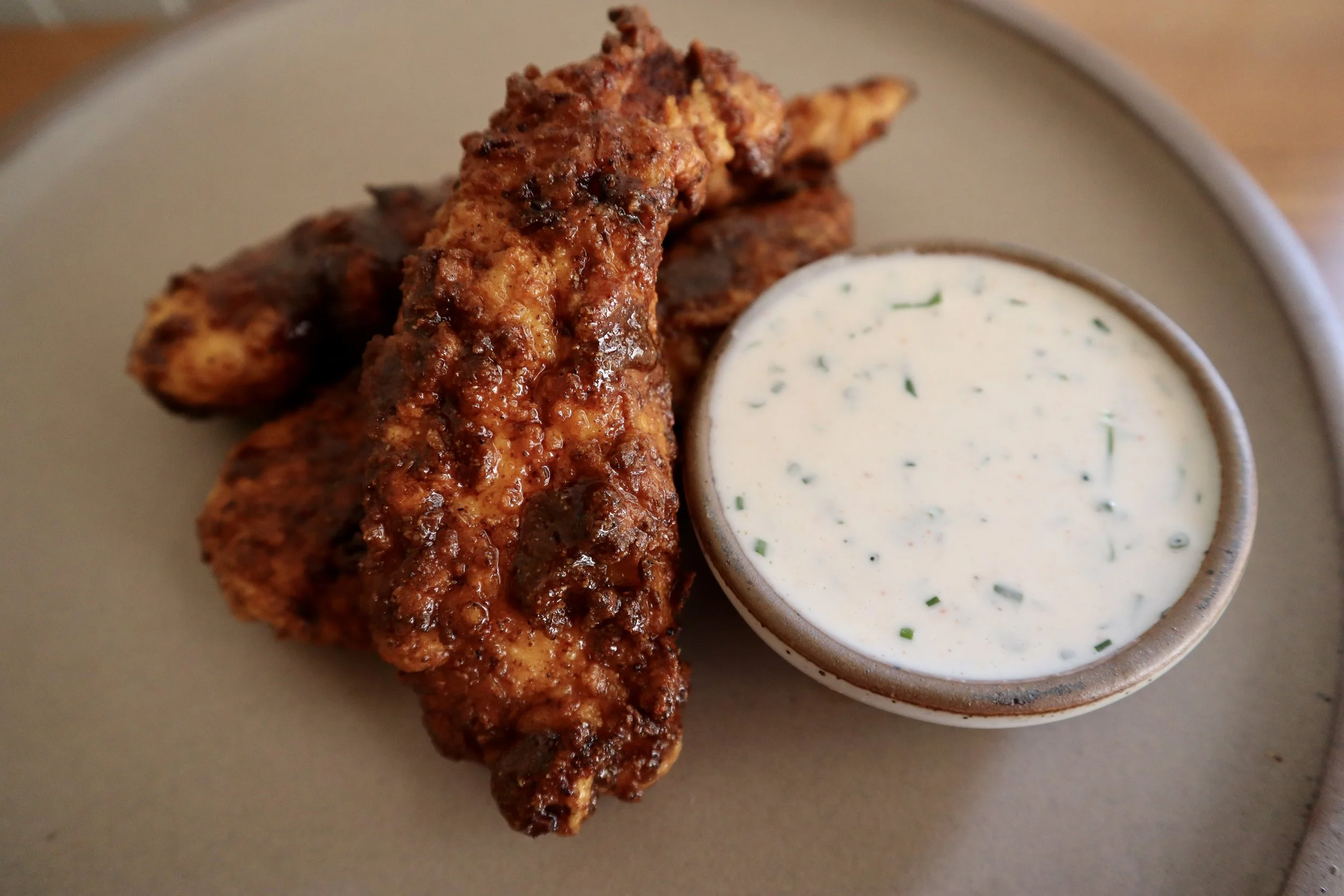 Marinate the chicken in buttermilk and spices for at least 4 hours. Coat each tender in a seasoned flour mixture, then let them rest so the breading adheres. Fry in hot oil until crispy and golden. Meanwhile, warm butter and whisk in cayenne, brown sugar, and seasonings to form a thick Nashville hot paste. Toss or brush the fried tenders with the spicy sauce and serve immediately with ranch.