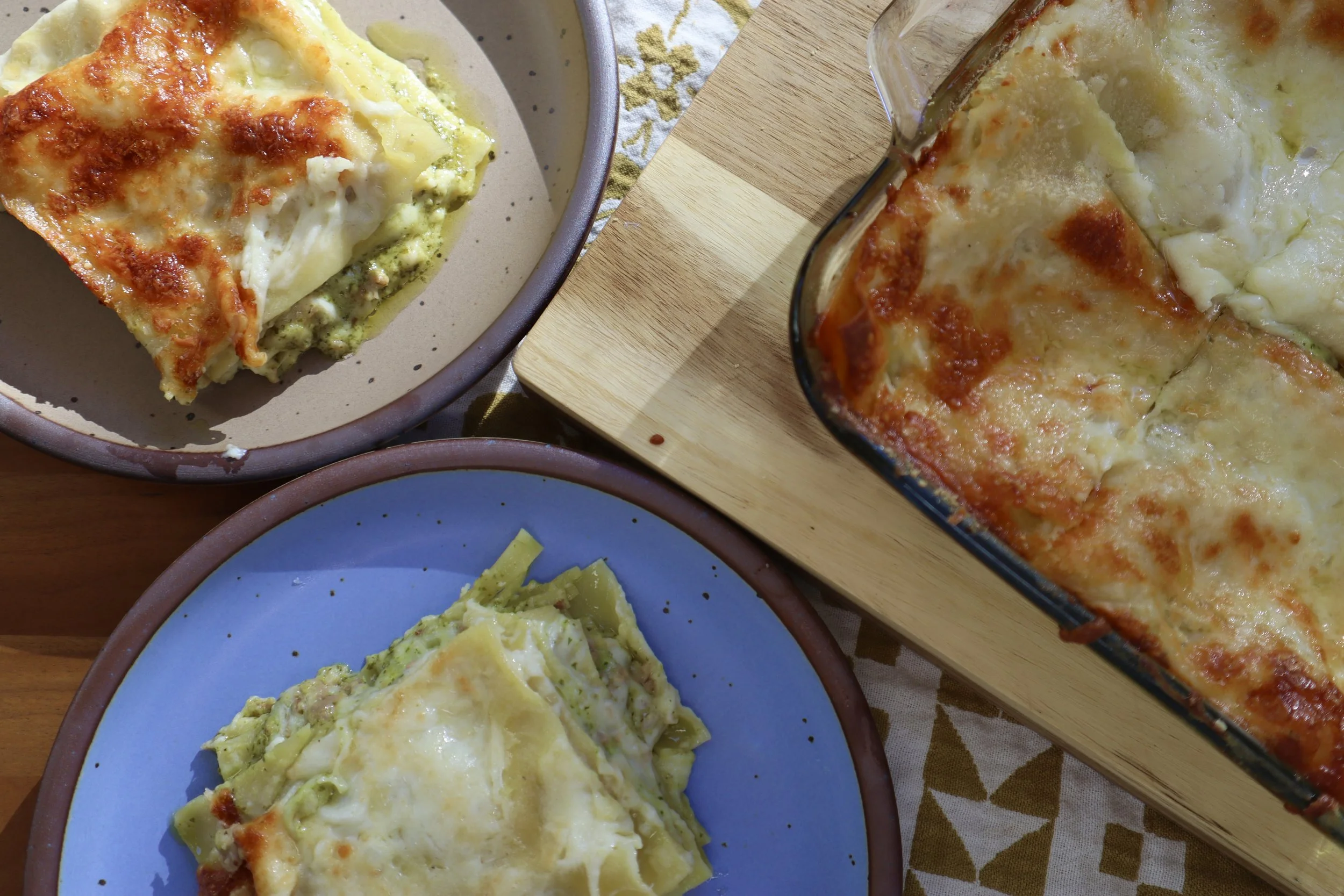 - Top layer: noodles → remaining béchamel → mozzarella + Parmigiano Reggiano (no pesto on top).
