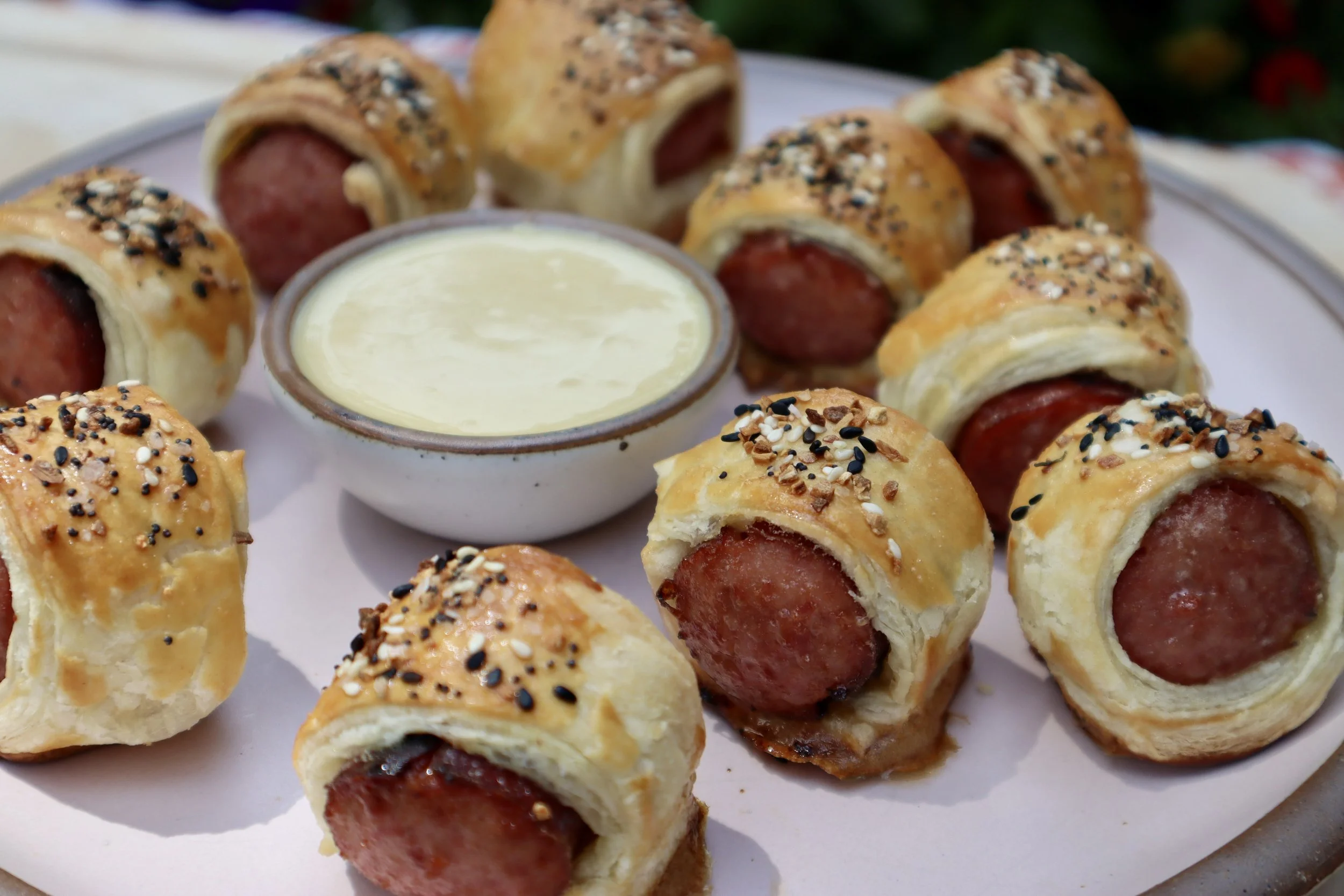 Grill the smoked sausage for extra flavor, then cut it into 2-inch pieces. Roll out thawed puff pastry and cut into rectangles that can wrap around each sausage piece. Roll tightly, seal with egg wash, and place seam-side down on a baking sheet. Brush with egg wash, sprinkle with everything seasoning, and bake until golden and crisp. Stir together mayo, Dijon, and honey for an easy dip. Serve warm.