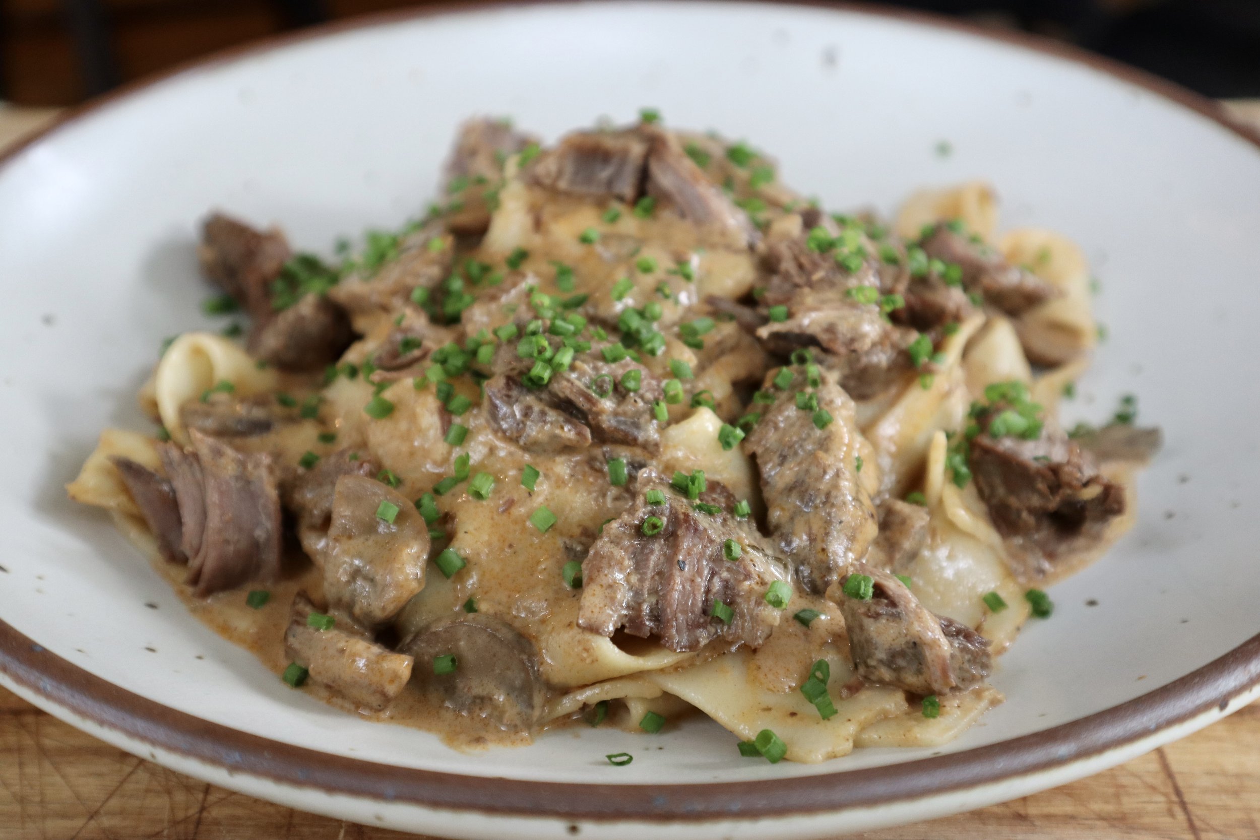 This started because my employee Carson mentioned he was making Beef Stroganoff, and I thought, “Wait… that sounds good.” Once I started playing around with the recipe I ended up subbing out a decent amount of ingredients- instead of traditional sirloin, I used well-marbled chuck roast and turned this into a braise—because who doesn’t want tender, fall-apart beef? I added cognac (obviously), bumped up the mushrooms, used pappardelle instead of egg noodles, and ended up with a totally delicious, over-the-top version of stroganoff. It’s cozy, comforting, and a little fancy—hence the name.