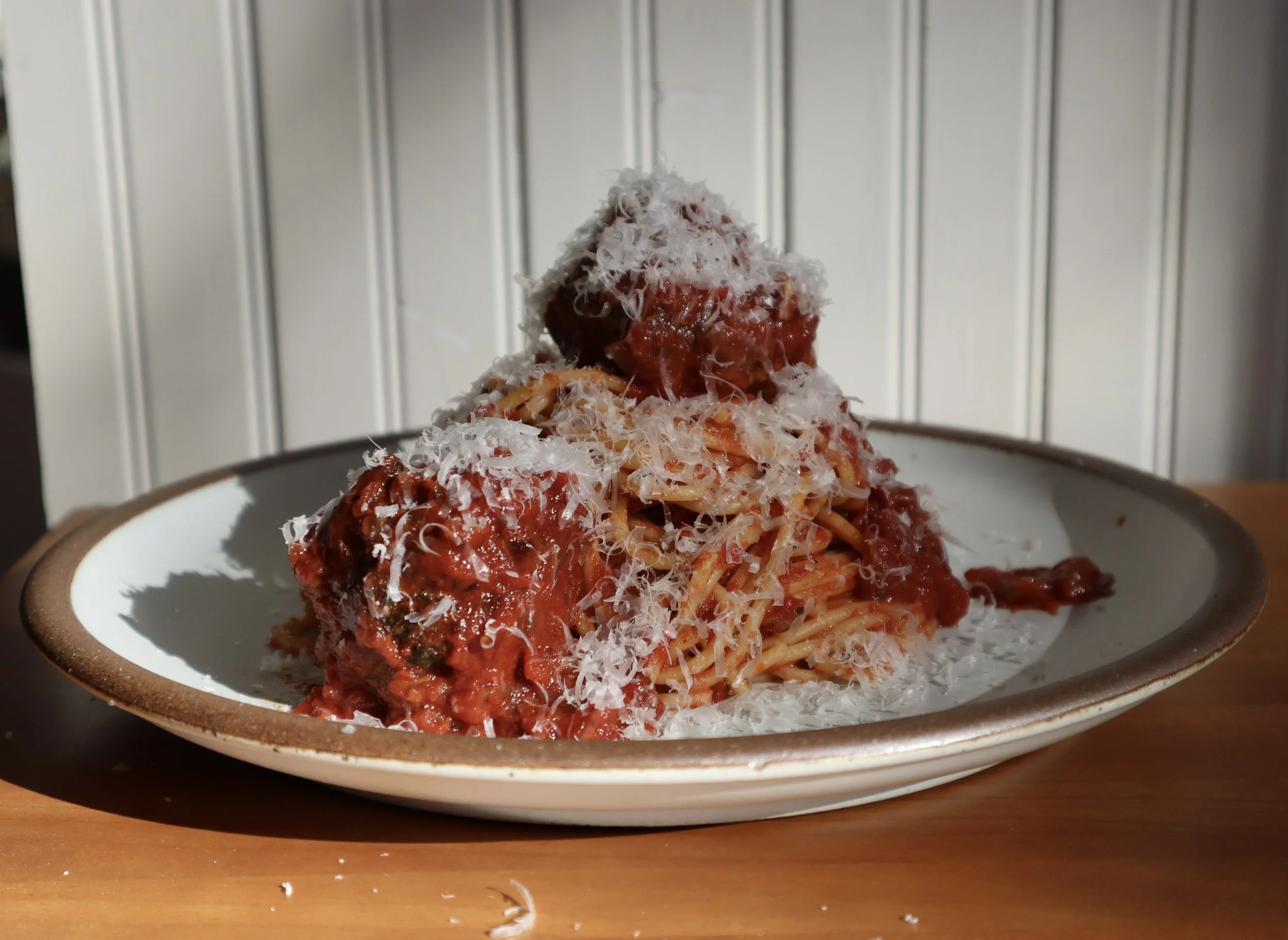 Mix the meatball ingredients together, shape into balls, and roast them in a beef-broth-lined pan until cooked through. Meanwhile, sauté the onions and garlic, add the wine to reduce, then stir in the tomatoes, herbs, sugar, and seasoning. Simmer until rich. Cook the spaghetti, toss it in butter and sauce, then add the meatballs and a heavy snowfall of Parmigiano Reggiano. Pure comfort.