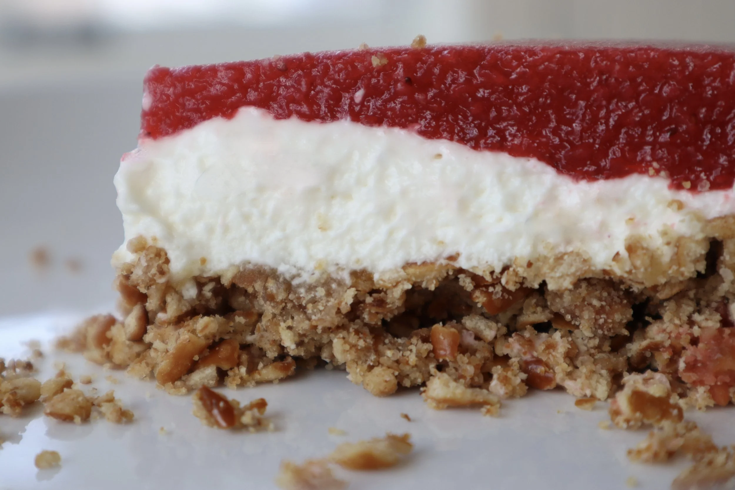 The cream cheese layer must completely cover the crust, all the way to the edges. Any gaps let the jello seep in and soften the pretzels.