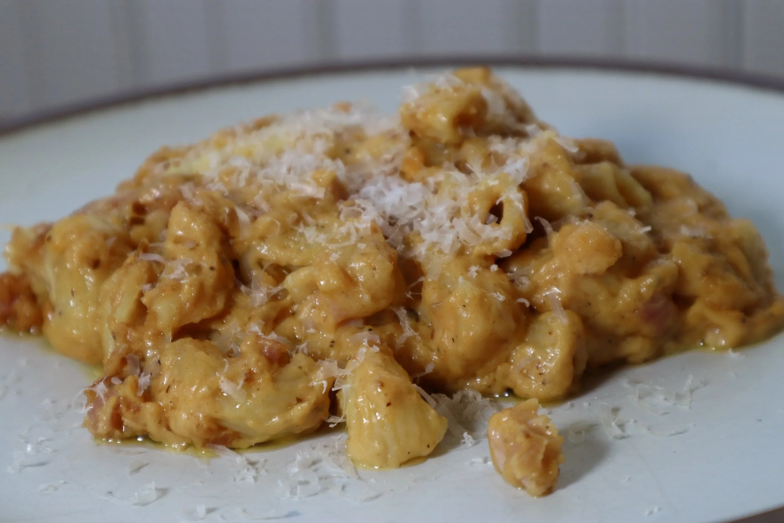 This Sweet Potato Macaroni & Cheese is rich, creamy, slightly sweet, smoky, and absolutely packed with flavor. Roasted sweet potatoes get blended into a velvety béchamel sauce, adding body and subtle sweetness without overpowering the cheese. Gruyere, cheddar, and gouda melt together into a silky, indulgent cheese sauce, while pancetta adds salty, crispy bites to balance everything out. It’s a macaroni and cheese that truly stands on its own—comforting, elevated, and so delicious.