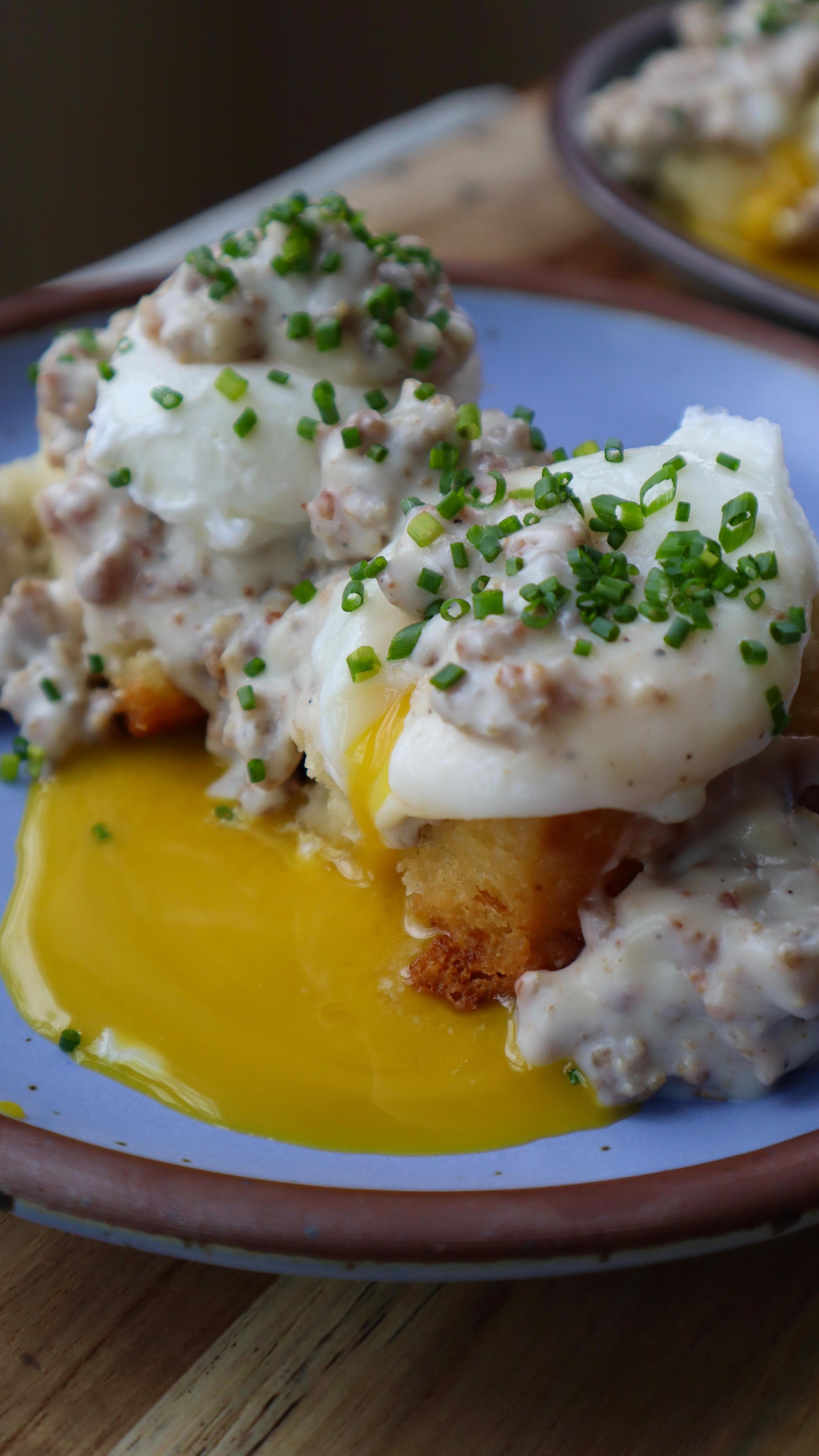 Buttery biscuits topped with creamy sausage gravy and runny poached eggs for the ultimate comfort breakfast.