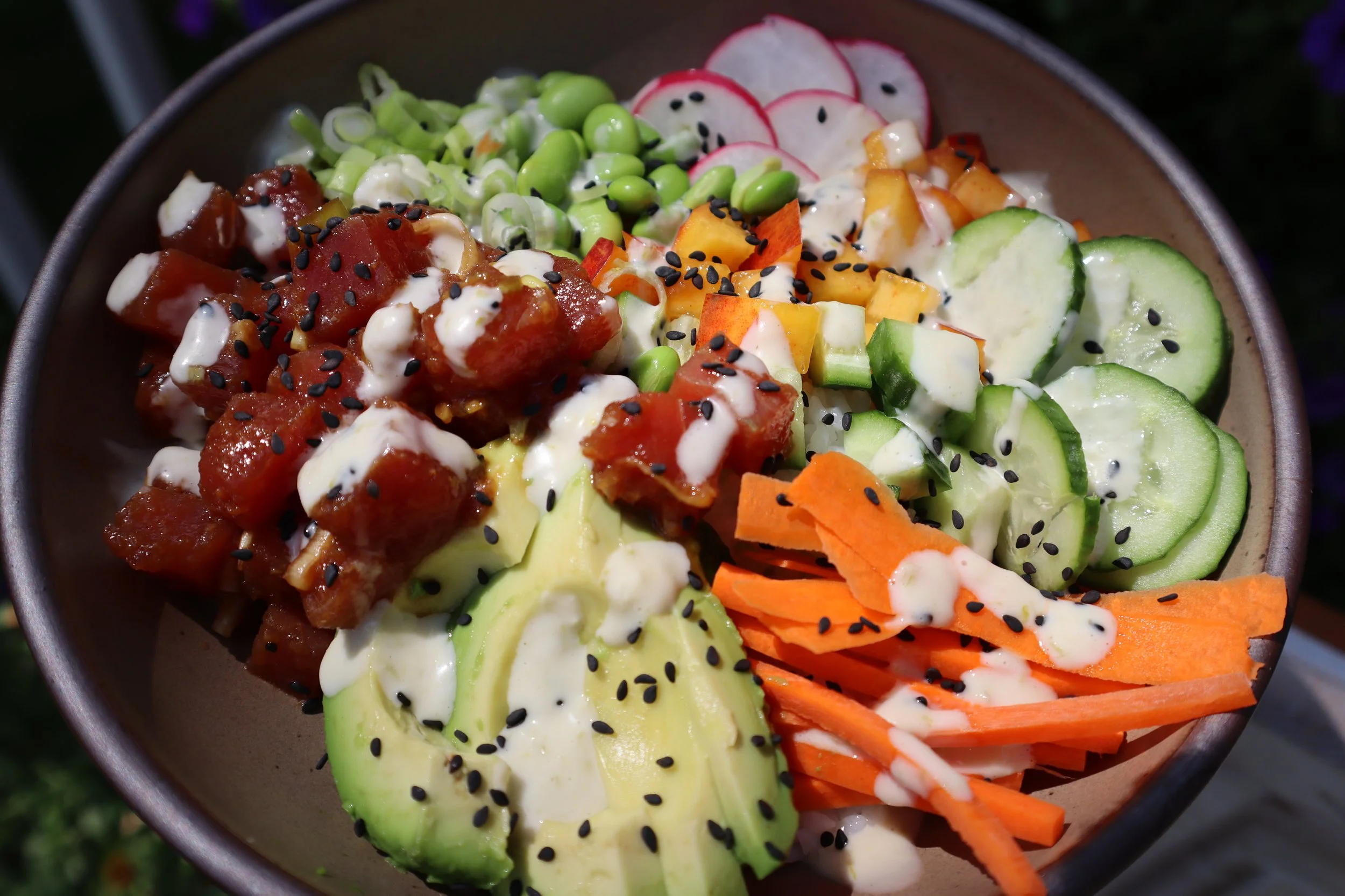 - Top each bowl with the marinated tuna, avocado slices, edamame, shredded carrots, cucumber, peach cubes, radishes, and green onions.