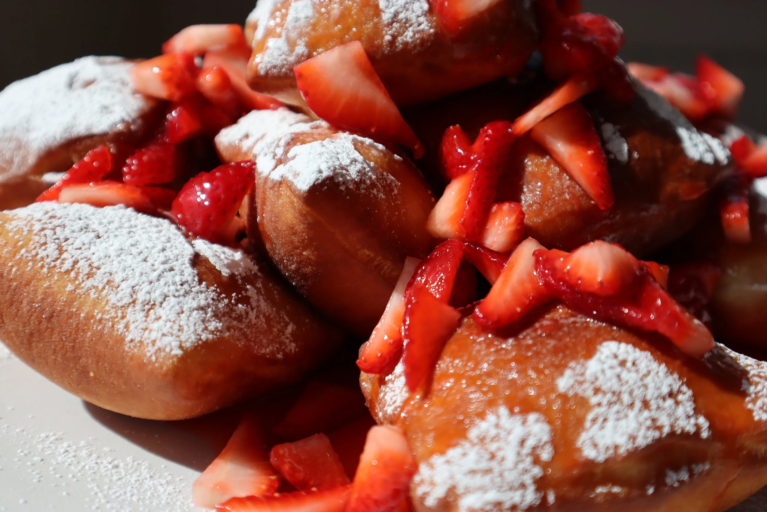 Vanilla Bean Cream Cheese Stuffed Beignets with Macerated strawberries