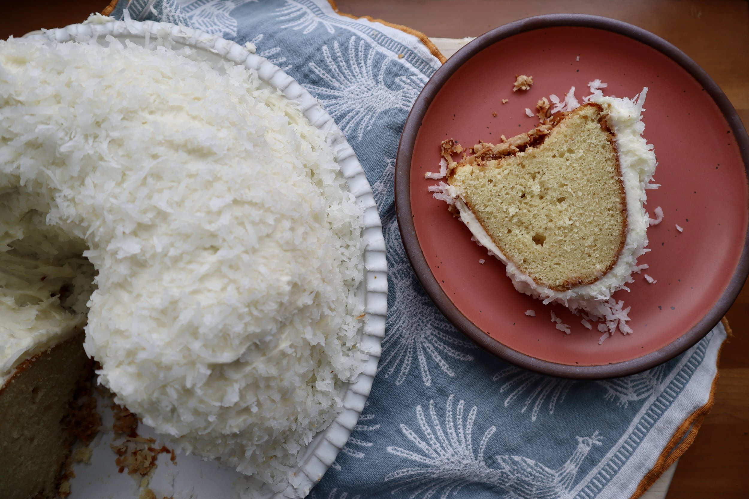 - Once the cake is completely cool, spread a thick layer of frosting over the top and down the sides of the bundt. Working in sections, press the shredded coconut into the frosting until the cake is fully coated. Chill briefly to set if desired, then serve at room temperature.